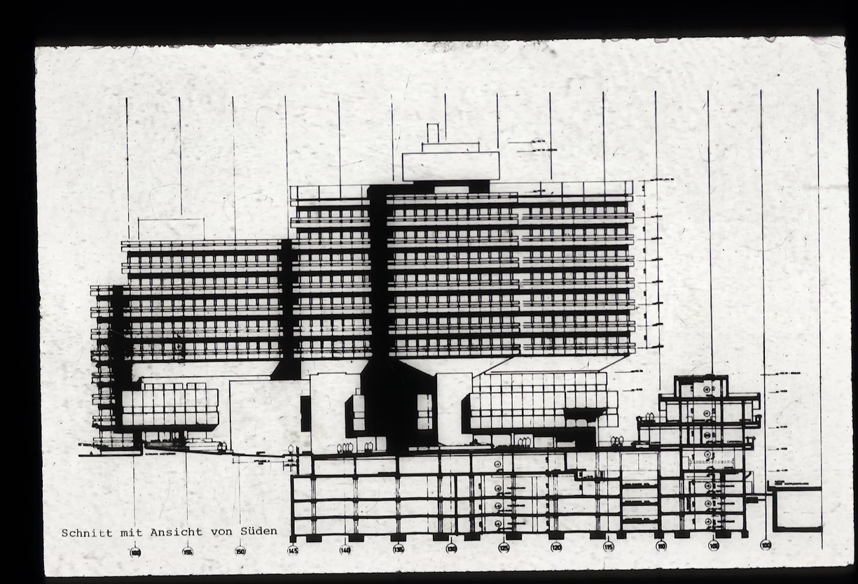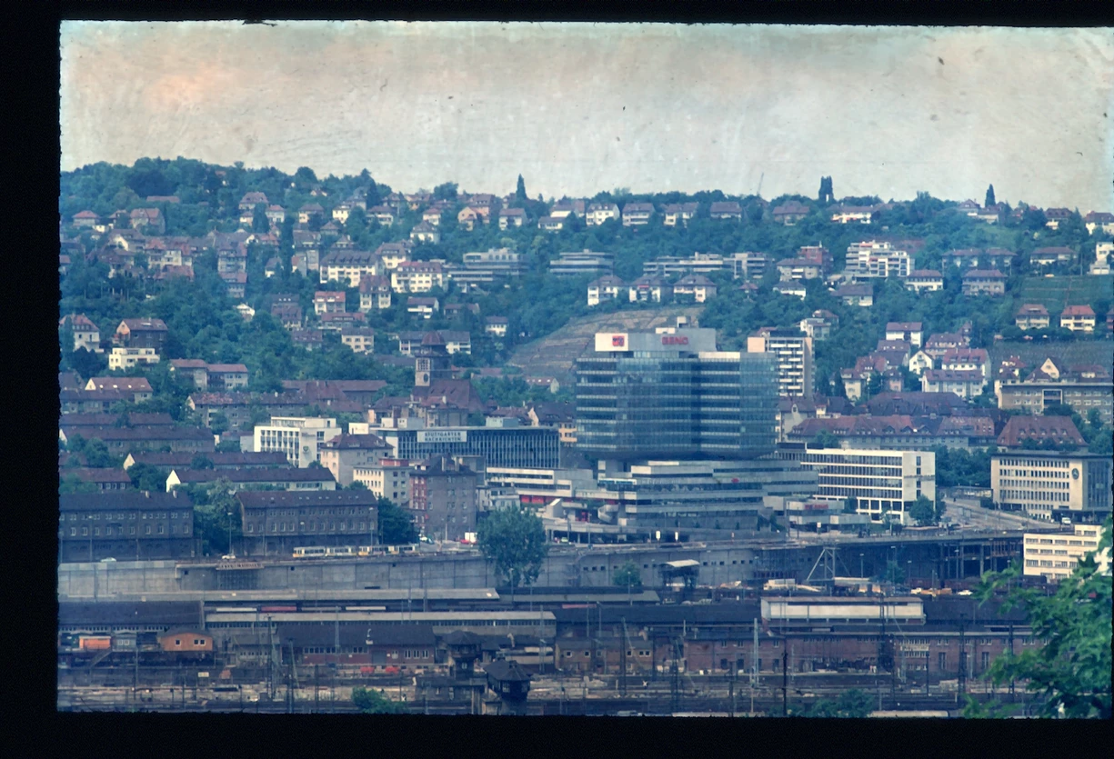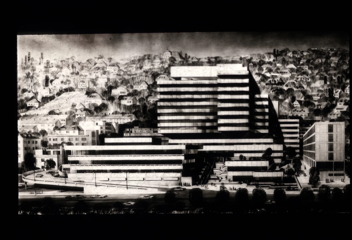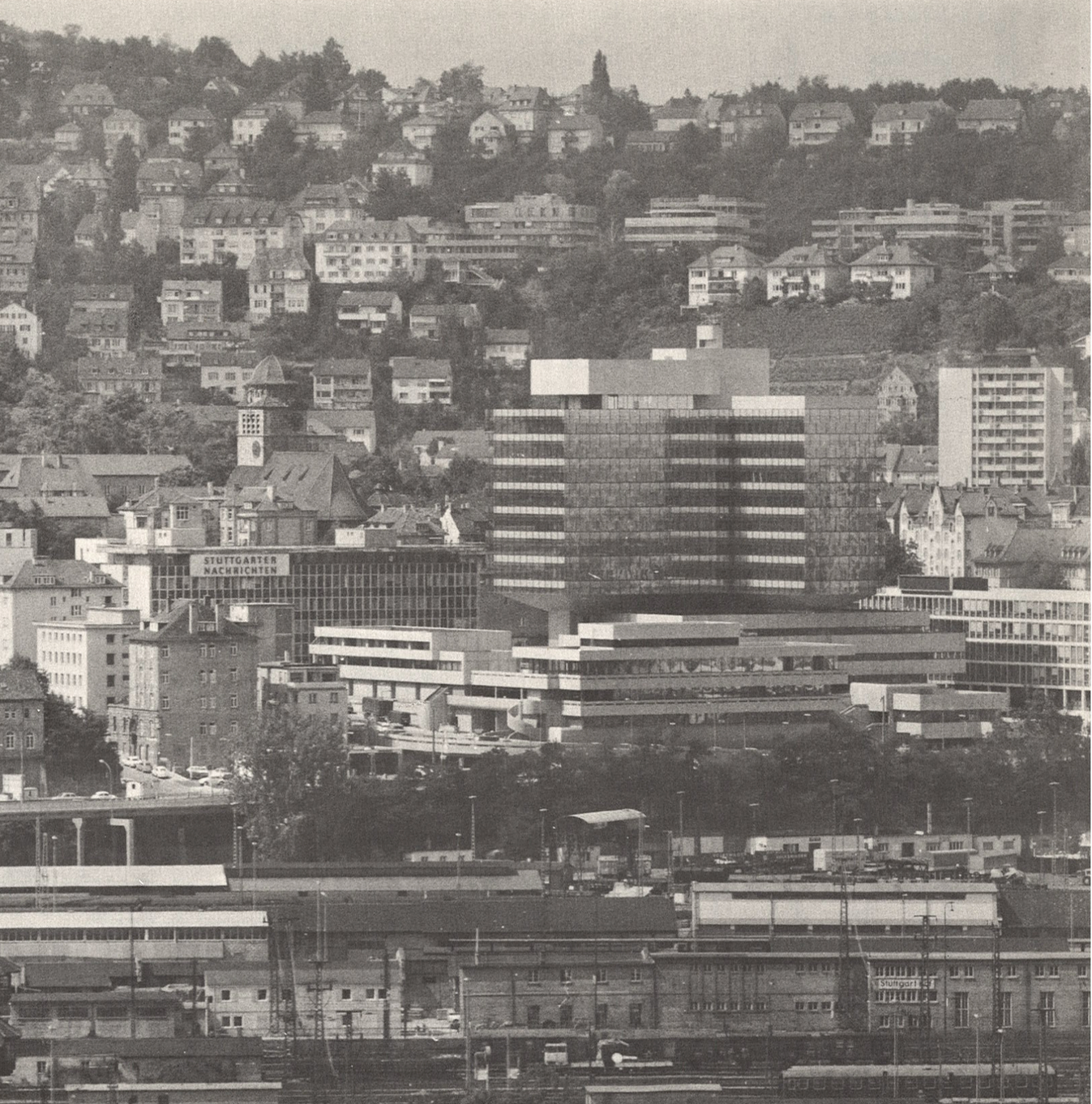 Das GENO-Haus in seiner schwierigen städtebaulichen Lage zwischen Bahngleisen im Süden, wo heute das Europaviertel steht, und der kleinteiligen Hangbebauung.