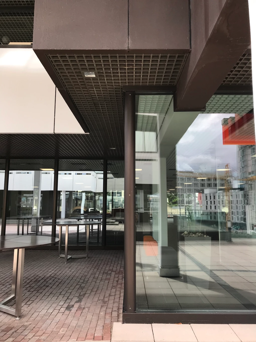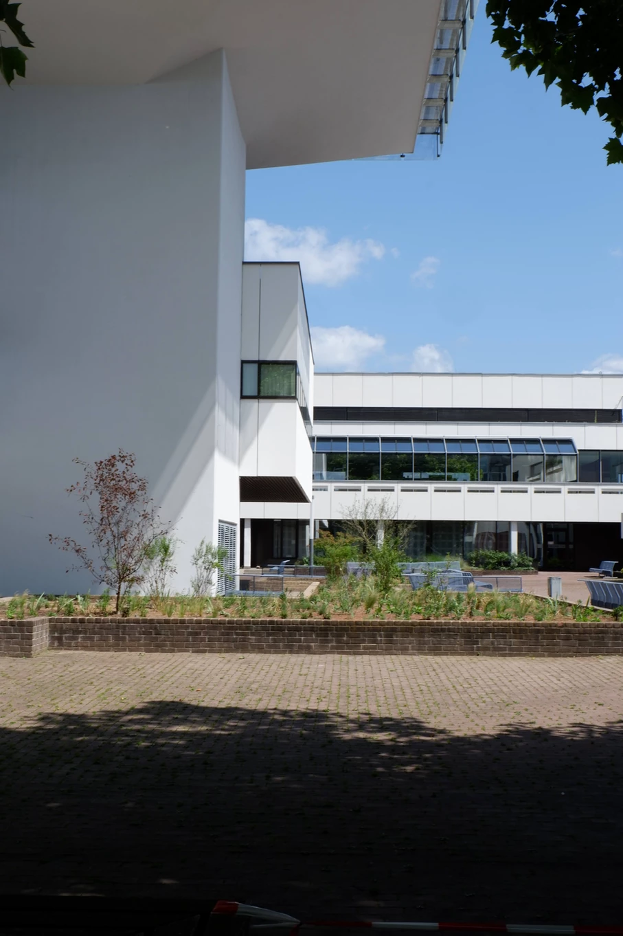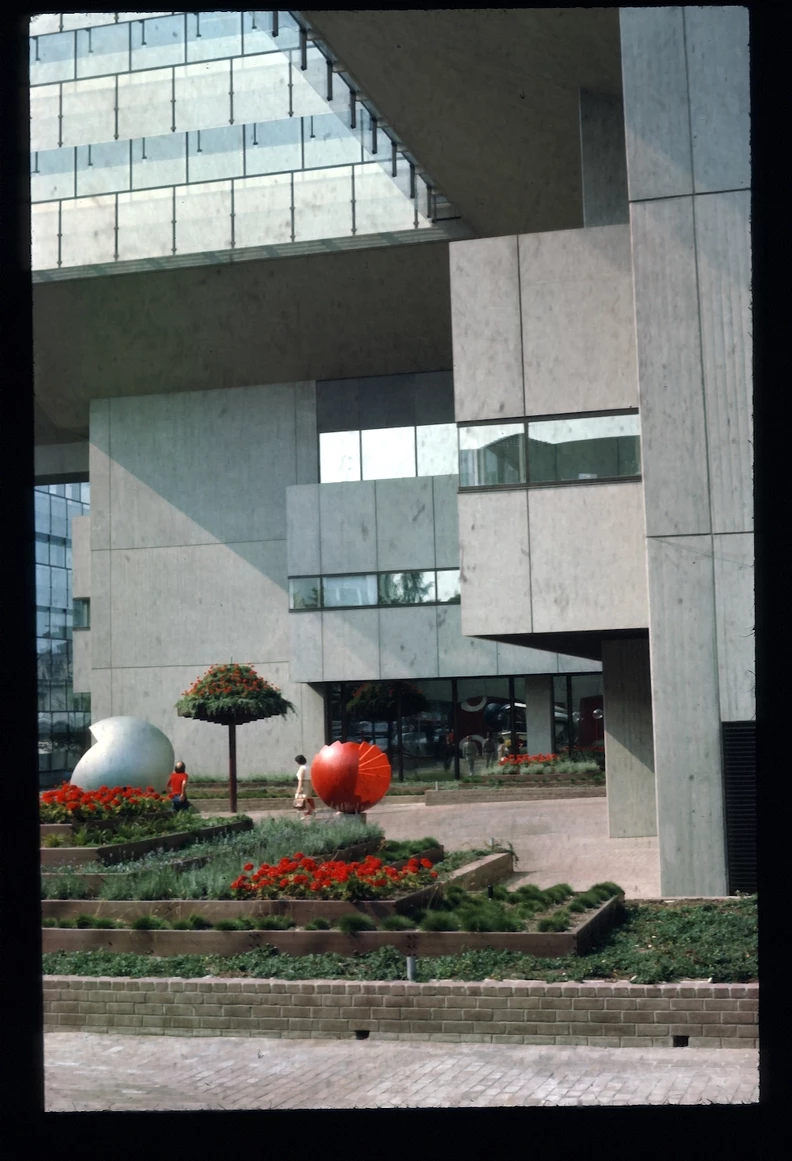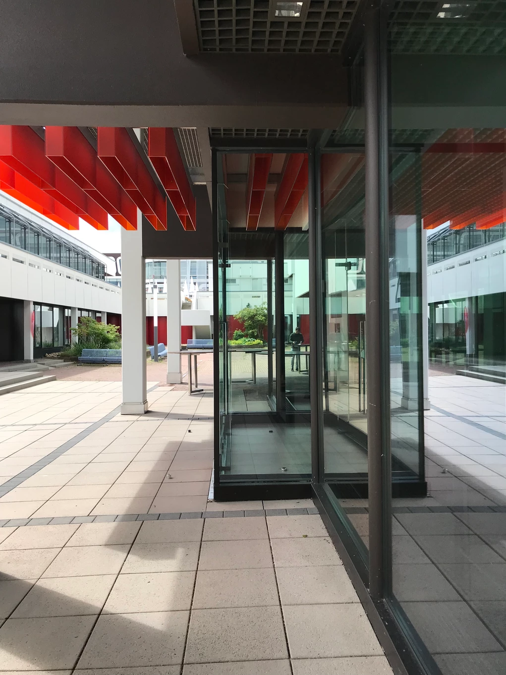 Blick über den zentralen öffentlichen Platz mit Ladengeschäften und Wohnungen rechts, dem Hauptbau links und geradeaus der Kantine. Heutiger Zustand, Abfanggeschoss Im Abfanggeschoss ist die Technik untergebracht. Außerdem vermittelt das Detail zwischen der Leichtigkeit der Obergeschosse und der Massivität des Sockels.