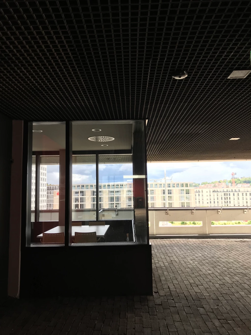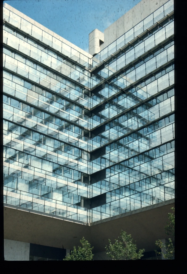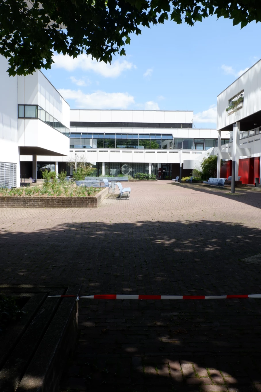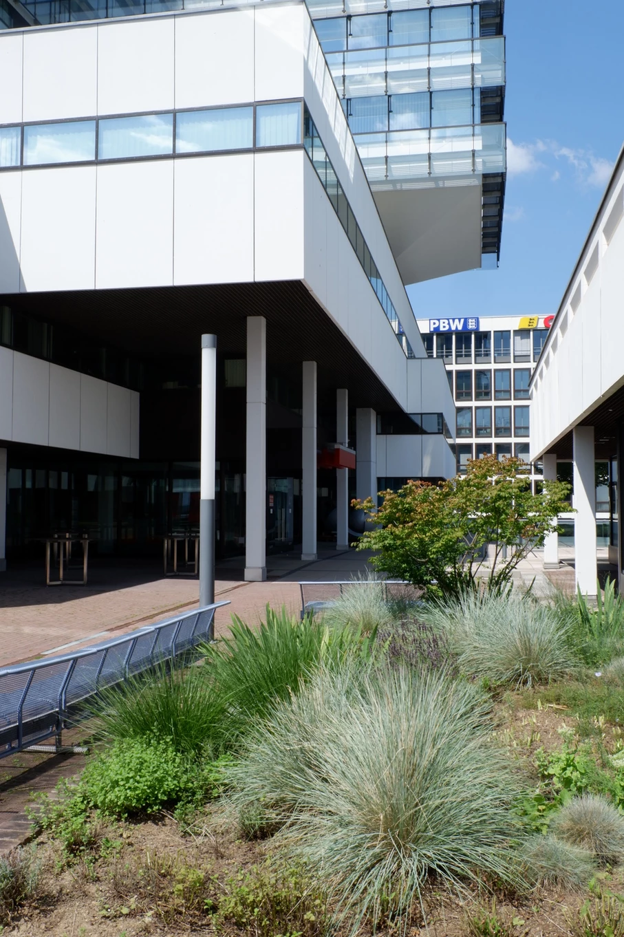 Blick über den zentralen öffentlichen Platz mit Ladengeschäften und Wohnungen rechts, dem Hauptbau links und geradeaus der Kantine. Heutiger Zustand, Abfanggeschoss Im Abfanggeschoss ist die Technik untergebracht. Außerdem vermittelt das Detail zwischen der Leichtigkeit der Obergeschosse und der Massivität des Sockels.