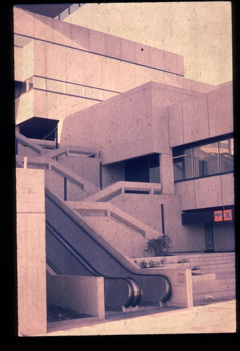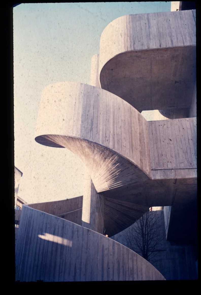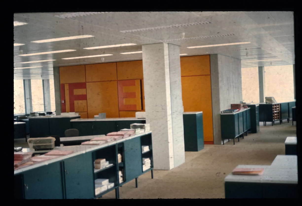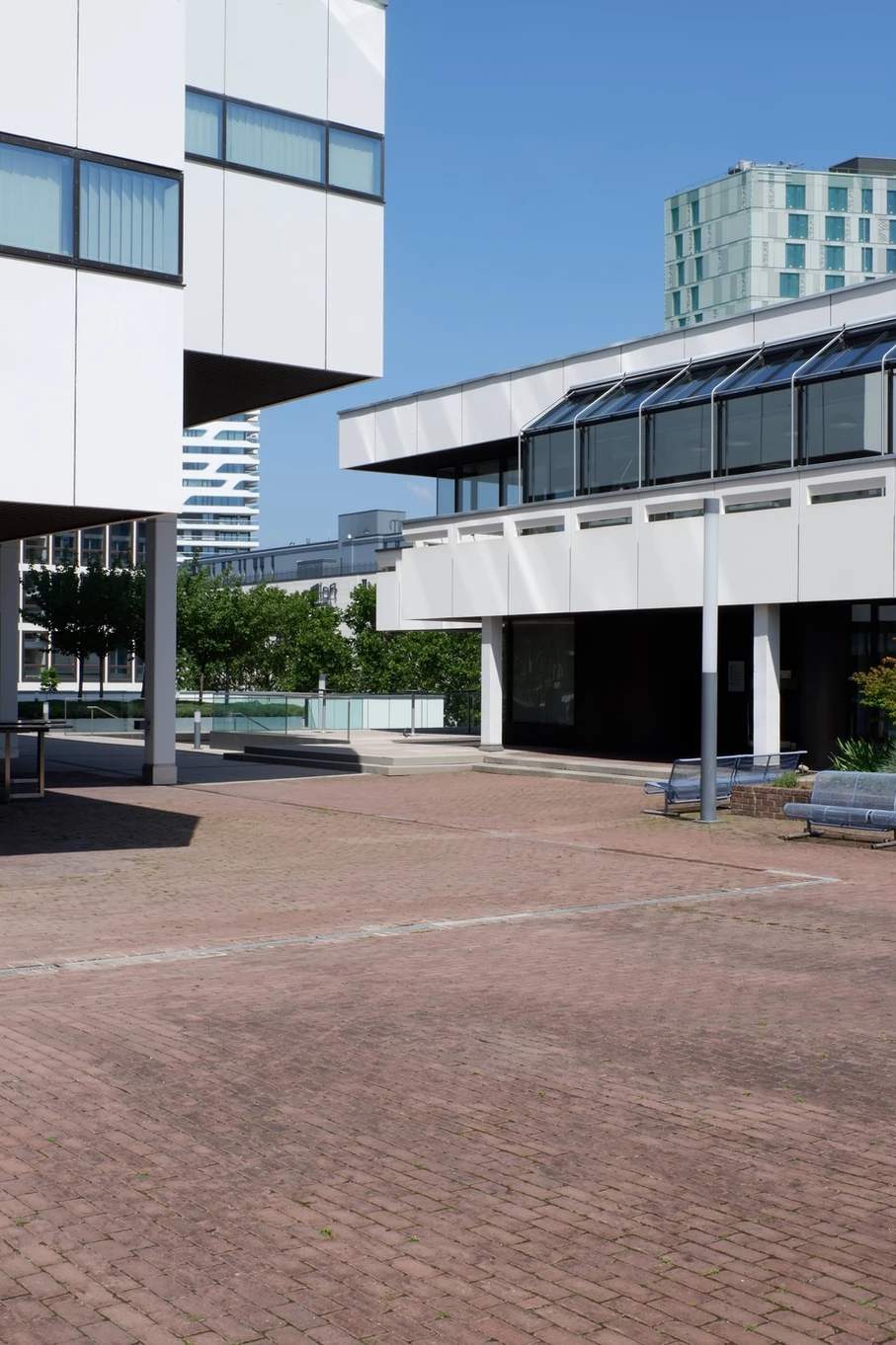 Blick über den zentralen öffentlichen Platz mit Ladengeschäften und Wohnungen rechts, dem Hauptbau links und geradeaus der Kantine. Heutiger Zustand, Abfanggeschoss Im Abfanggeschoss ist die Technik untergebracht. Außerdem vermittelt das Detail zwischen der Leichtigkeit der Obergeschosse und der Massivität des Sockels.