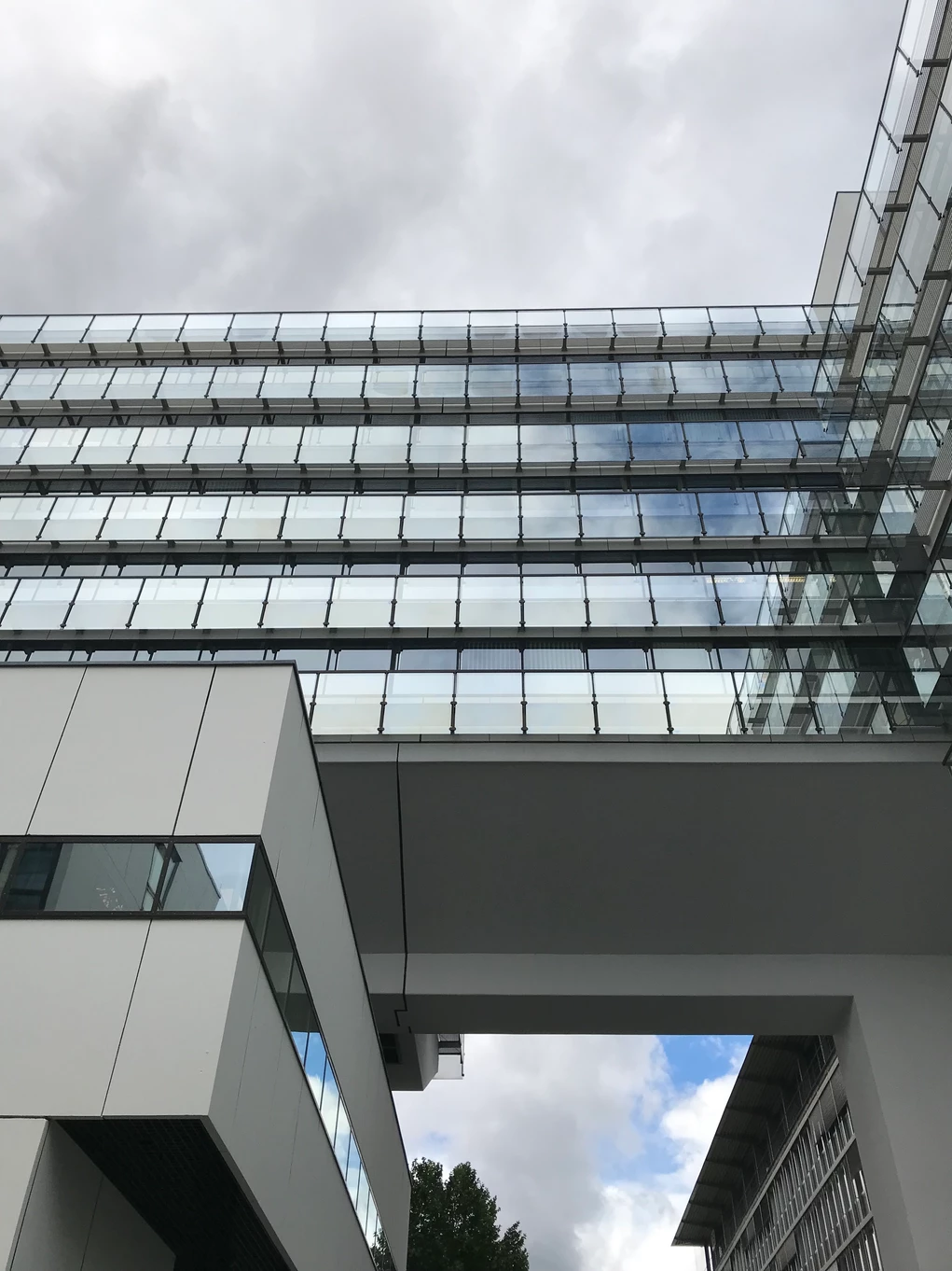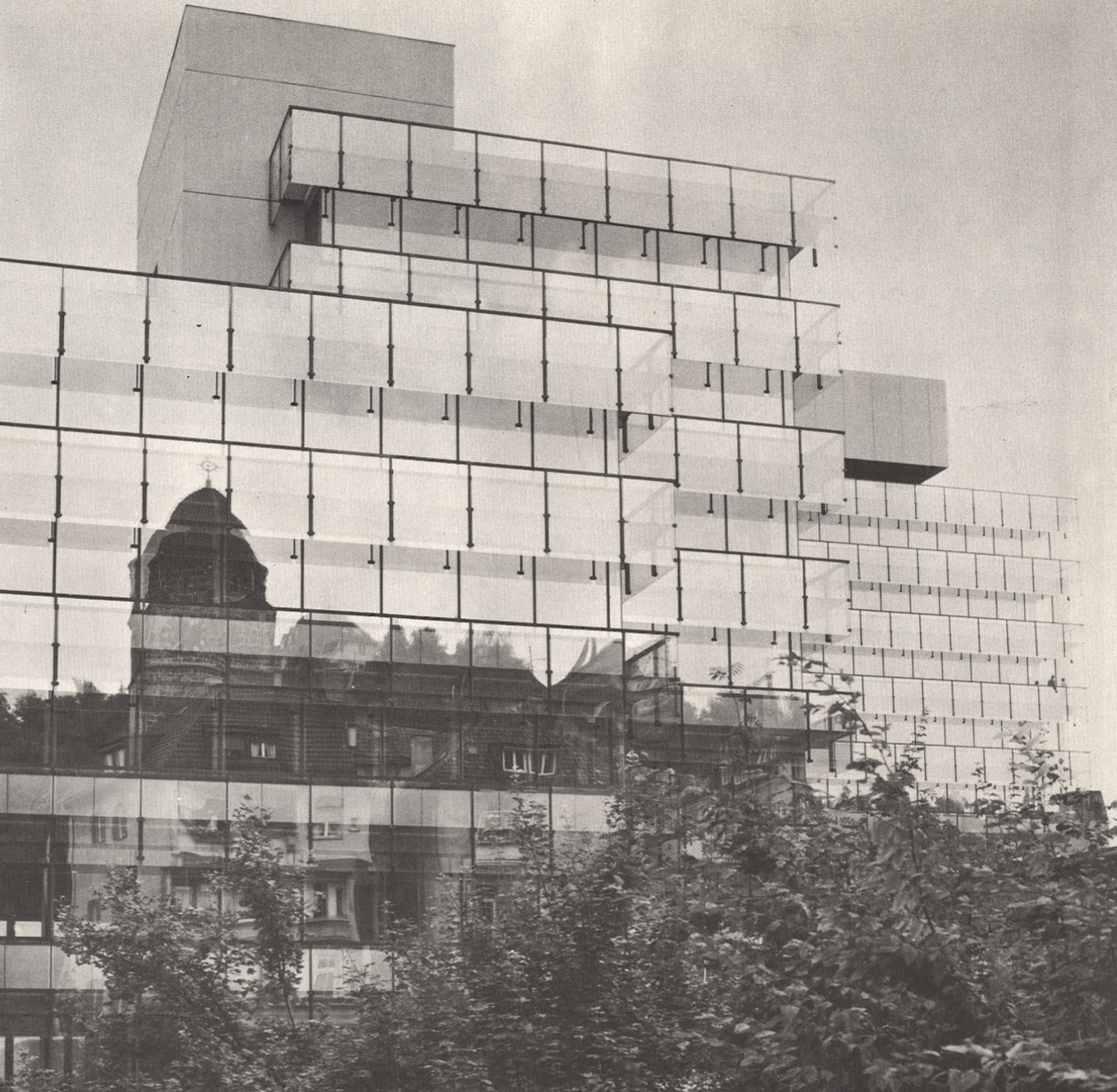 Das Spiel des leichten Versetztens der Spiegelungen an der Glassfassade lässt das Gebäude leicht erscheinen und erzeugt trotzdem eine gewisse Plastizität.